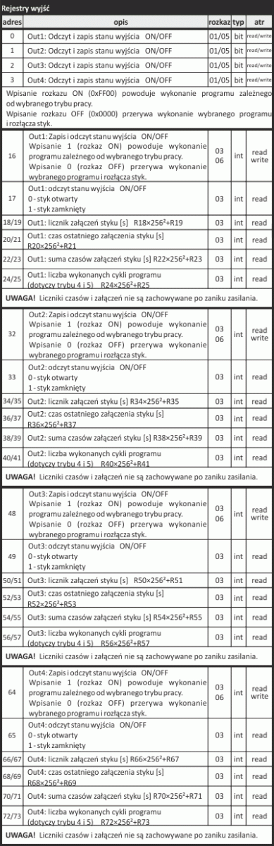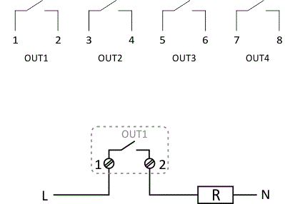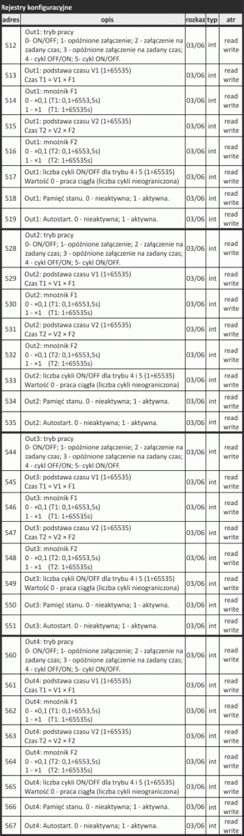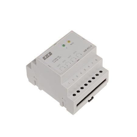 Das Steuerungsmodul MR-RO-4 ist mit vier unabhängig gesteuerten Relaisausgängen (mit getrennten Kontakten) ausgestattet. Jeder dieser Ausgänge arbeitet autonom, entsprechend dem gewählten Modus und den zugewiesenen Parametern. Die Konfiguration und Überwachung des Zustands der Ausgänge, die Einstellung der Betriebsparameter sowie alle Kommunikations- und Datenaustauschparameter erfolgen über den RS-485-Port unter Verwendung des MODBUS RTU-Protokolls. Das Vorhandensein der Versorgungsspannung wird durch das Aufleuchten der grünen LED mit der Bezeichnung U signalisiert. Die korrekte Datenübertragung zwischen dem Modul und einem anderen Gerät wird durch das Aufleuchten der gelben LED Tx angezeigt.