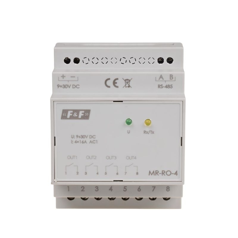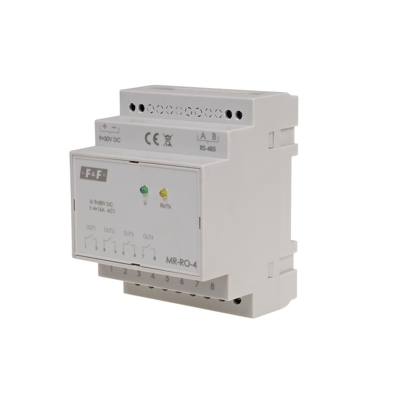 - Das F&F-Relaismodul MAX-MR-RO-4 ist eine zuverlässige Lösung für die Gebäude- und Industrieautomation. Es bietet 4 16A Ausgänge, MODBUS RTU Steuerung über RS-485, Statusspeicher, DIN-Schienenmontage und einen weiten Spannungsbereich von 9-30V DC.