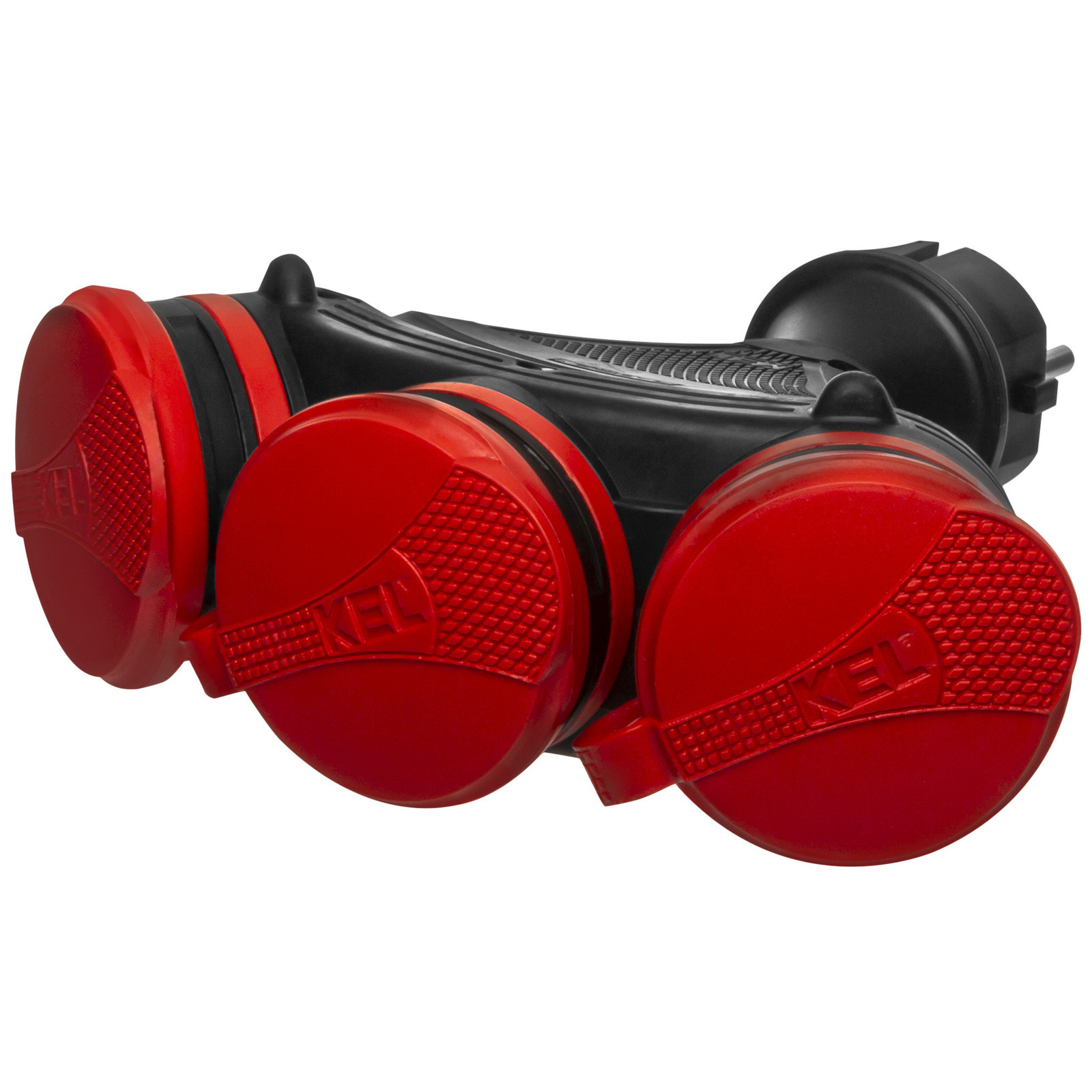 - Robuster, zerlegbarer Verteiler in Schwarz-Rot mit drei spritzwassergeschützten 2P+E-Steckdosen Schuko 16A 250V und Schutzklappen. Schutzart IP44 – ideal für den Einsatz unter anspruchsvollen Außen- und Industriebedingungen.