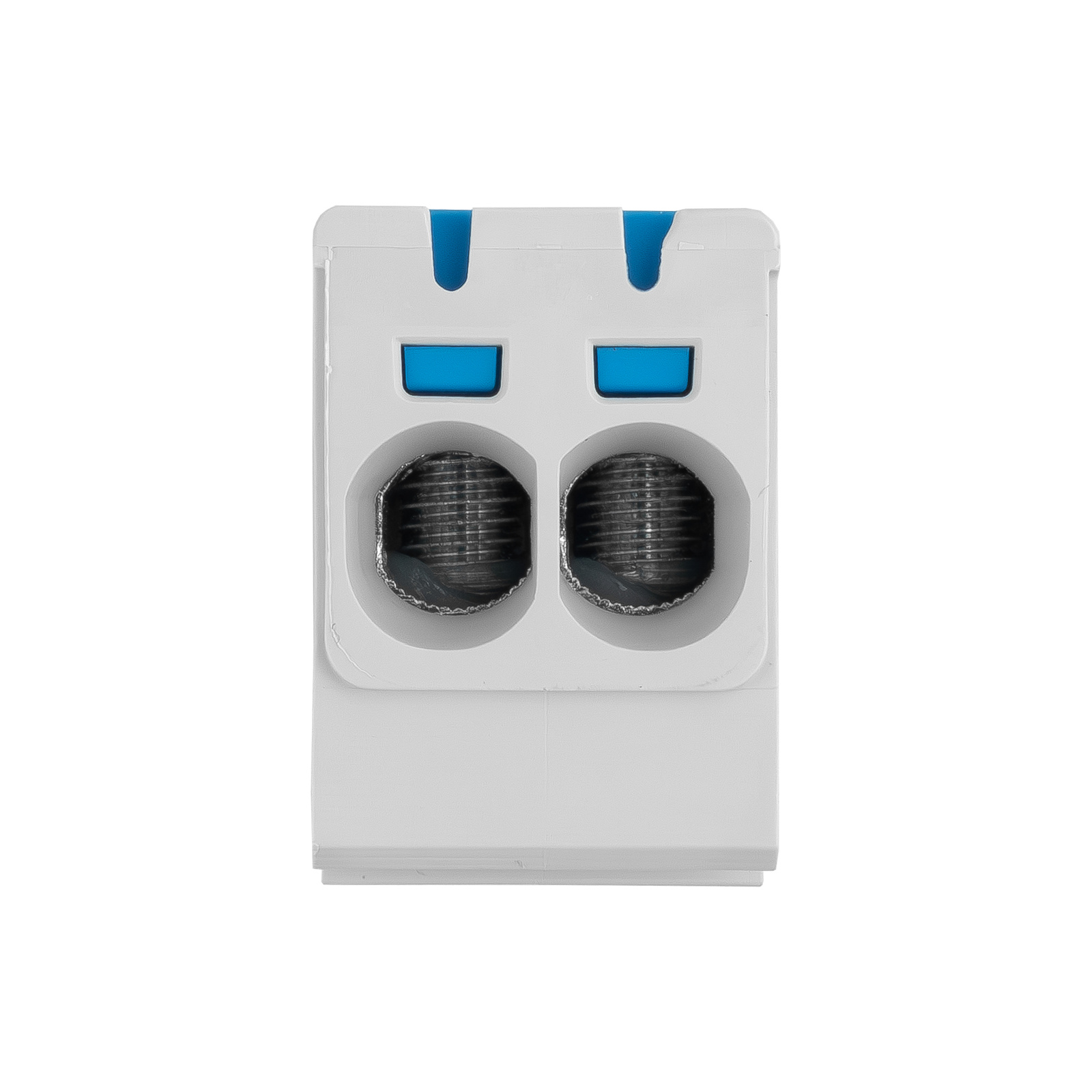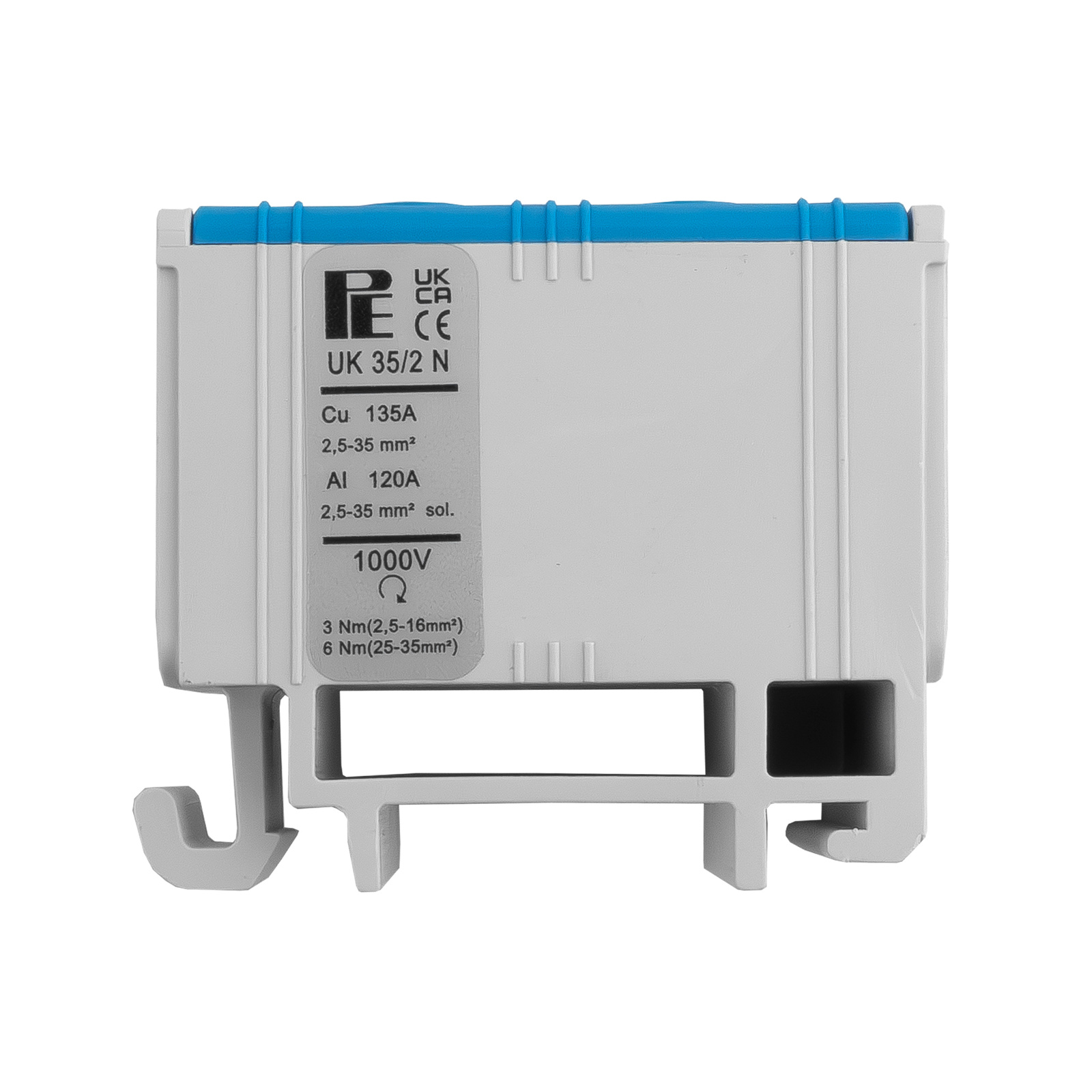 - UK35/2 N Universalklemme mit vier Löchern für Al/Cu-Leiter 2,5-35mm2 in blau. Geeignet für die Montage auf DIN-Schiene TH-35.