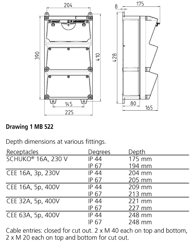 - Professioneller tragbarer Mennekes Steckdosen-Kombination 930010 mit einem Nennstrom von 32/16 A, ausgestattet mit CEE-Steckdosen 32 A, 5 p, 400 V, CEE 16 A, 5 p, 400 V sowie 2 Schuko® 16 A, 230 V.