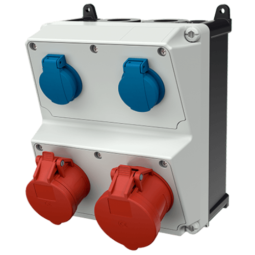 - Die Mennekes Steckdosen-Kombination ist mit einer breiten Palette von Steckdosen ausgestattet: eine CEE 32 A (400 V), eine CEE 16 A (400 V) und zwei Schuko® 16 A (230 V)