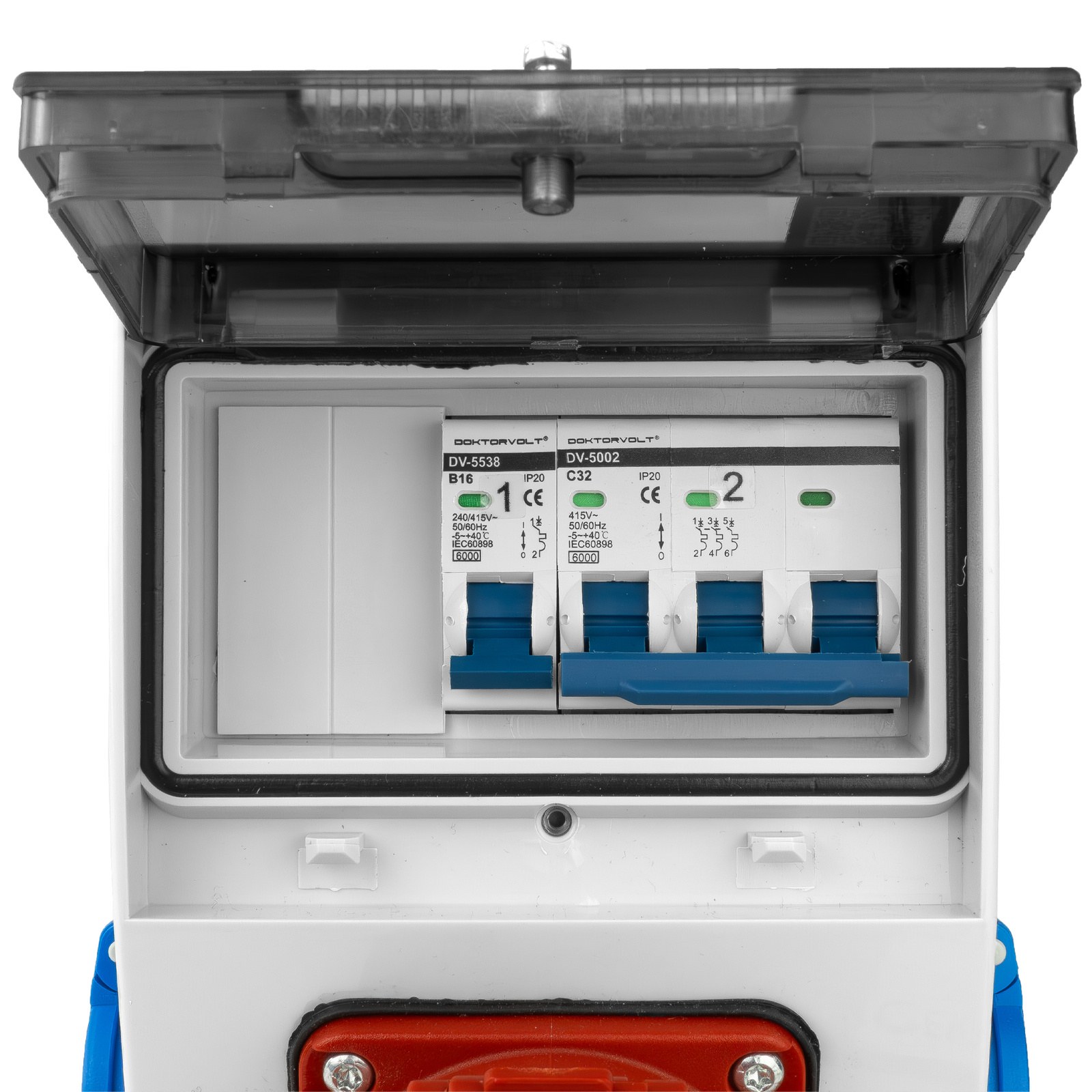 - Hochwertige Baustromverteiler XS DV-5060-D 32A 2x230V mit Absicherung. Ausgestattet mit Steckdosen der renommierten Marke DOKTORVOLT. Schutzart IP44 . Stromverteiler Komplett Verdrahtet.