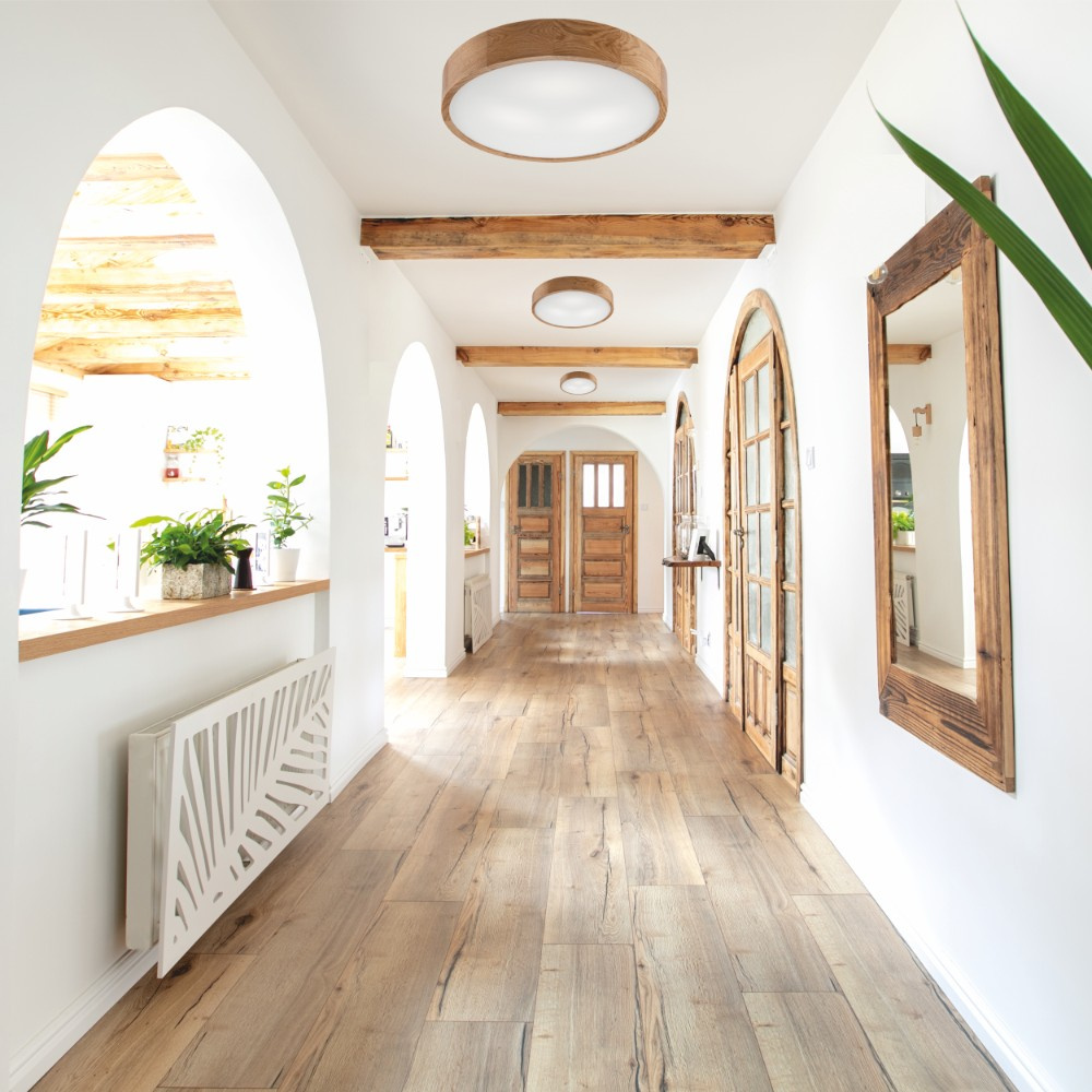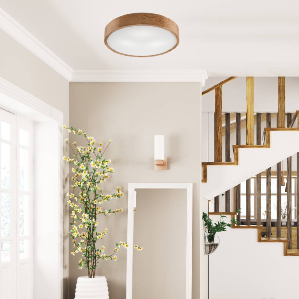 Die Leuchte wird direkt an der Decke oder Wand montiert. Der Holzrahmen haftet vollständig an der Oberfläche.