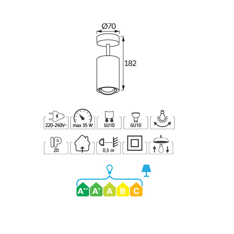 Deckenleuchte mit GU10 Fassung. Das ästhetische Design der Leuchte verleiht dem Raum einen zusätzlichen ästhetischen Wert. Arbeitet mit Lichtquellen mit einer maximalen Leistung von bis zu 35W. Die hochwertige Deckenleuchte ist in weiss ausgeführt und verfügt über die Schutzart IP20. Das Produkt bietet die Möglichkeit, die Beleuchtungsposition einzustellen.
