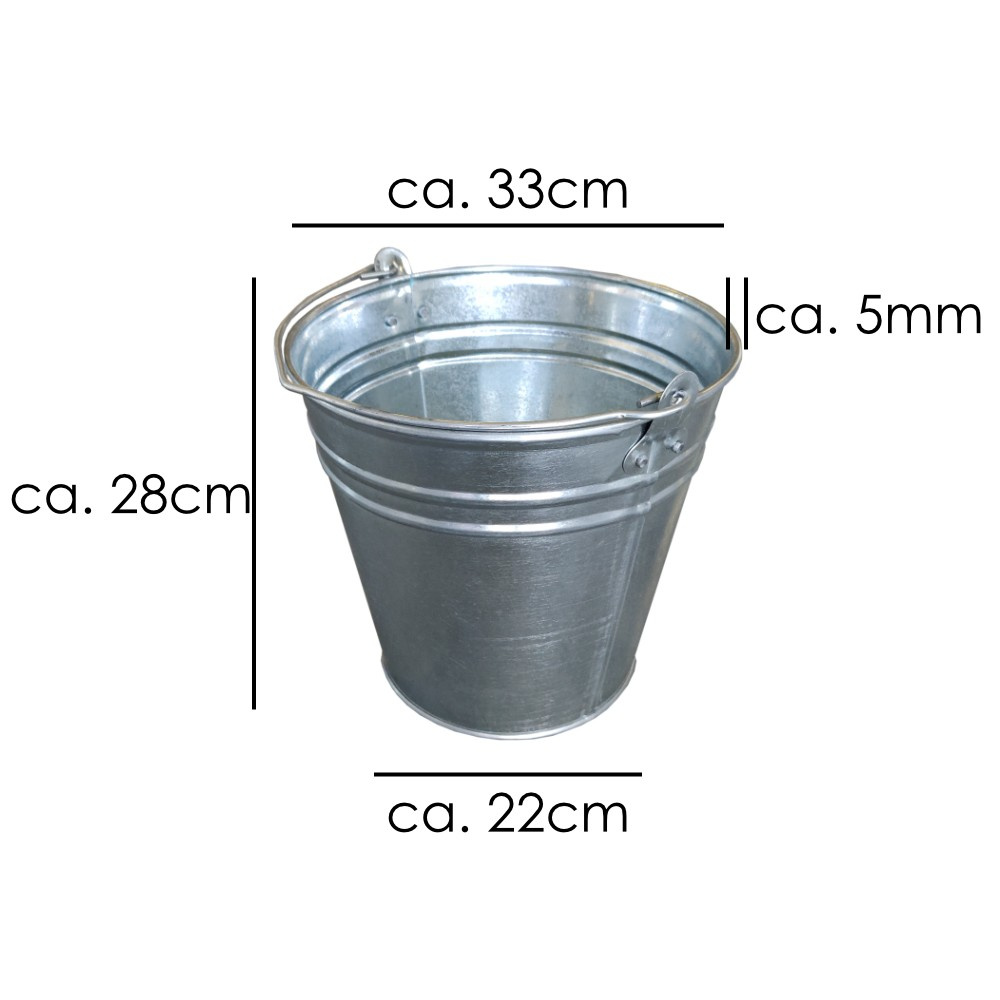 Verzinkter Eimer mit Metallgriff für den Einsatz im Garten und bei Baureparaturen. Die verstärkte Konstruktion sorgt für Komfort unter anspruchsvollen Bedingungen.