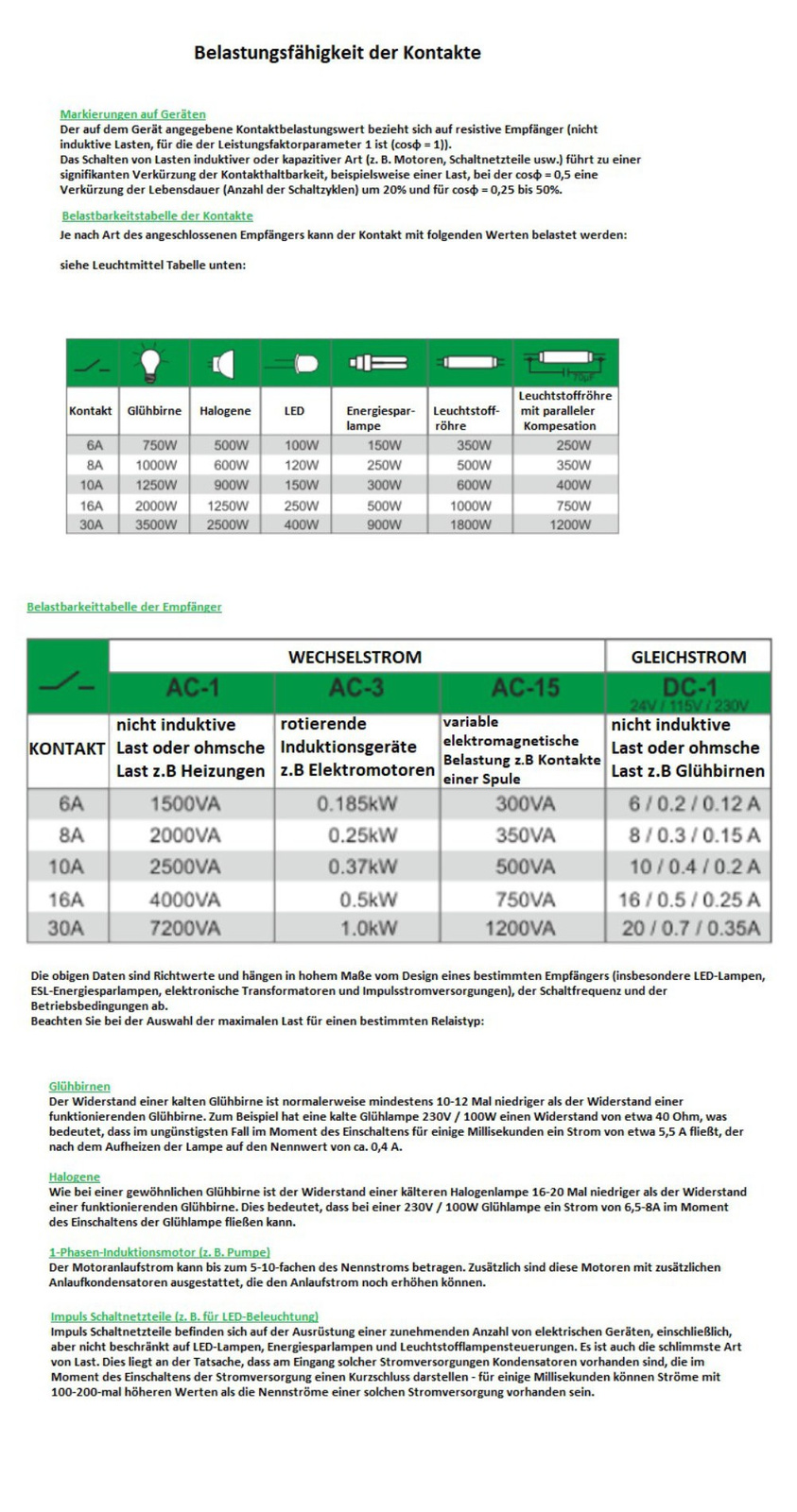 Die oben genannten Daten sind Richtwerte und hängen weitgehend von der Konstruktion des jeweiligen Empfängers (insbesondere LED-Lampen, Energiesparlampen, elektronische Transformatoren und Schaltnetzteile), der Schaltfrequenz und den Betriebsbedingungen ab. Mehr Informationen unter fif.com.pl