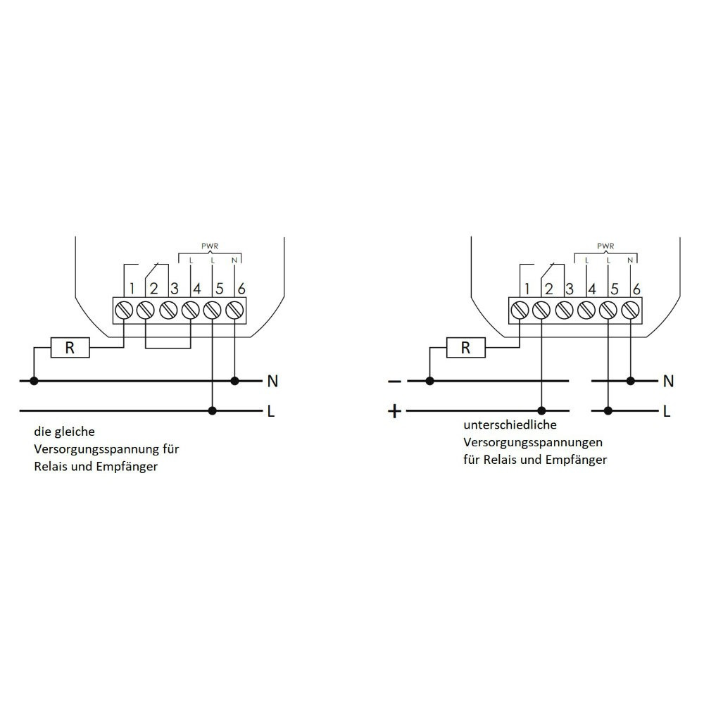 4) Schließen Sie den Stromversorgungskreis des gesteuerten Empfängers über die Kontakte 1-2 (Schließer) an Achtung! Bei gleicher Stromquelle für das Relais und den gesteuerten Empfänger kann eine "Brücke" zwischen Punkt 4/5 und Eingang 2 gebildet werden.