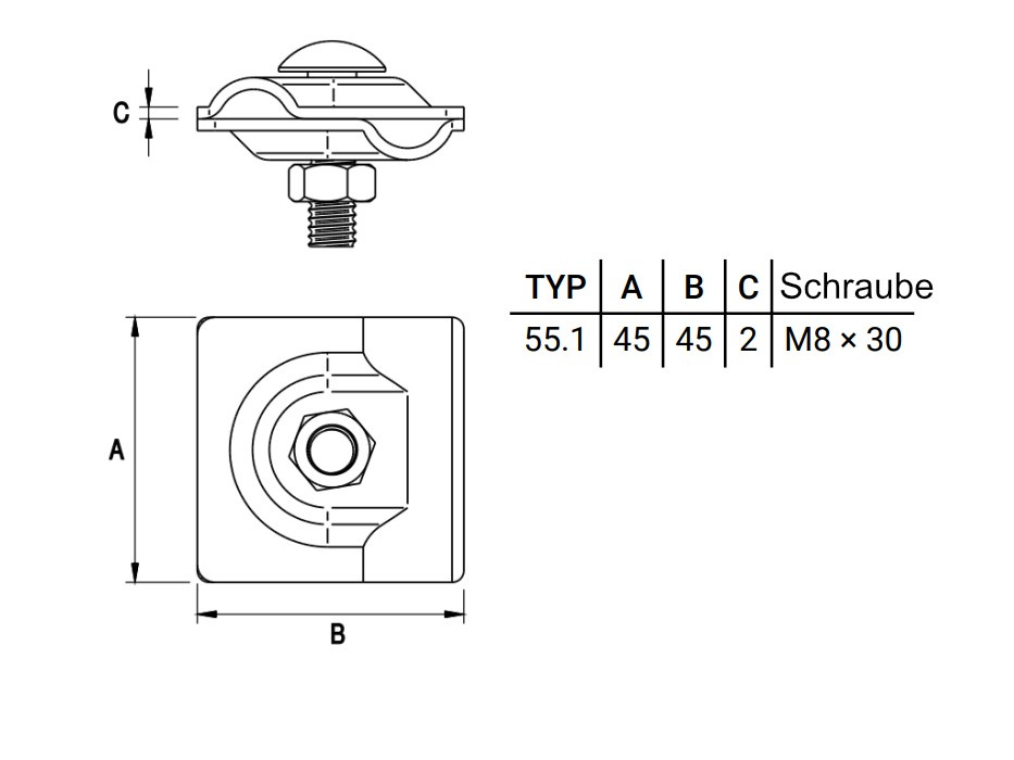 Die Querverbindung dient zur Querverbindung von Erdungsdraht oder Drahtverbindung mit Blinken an Dachböden. Der Verbinder besteht aus 2 Teilen mit einer Dicke von 2 mm und einer Schraube M8.