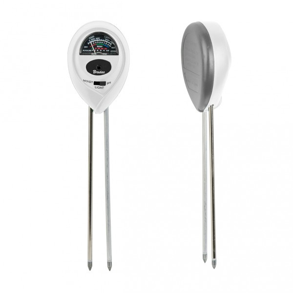 Das Gerät erlaubt es, sowohl den Säuregehalt und die Feuchtigkeit des Bodens als auch die Intensität der Sonneneinstrahlung zu messen.