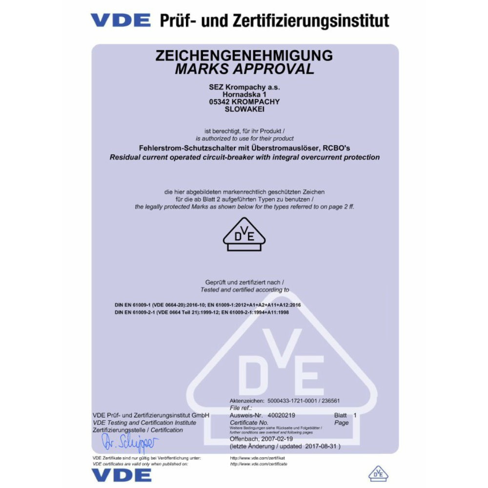 VDE DIN EN 61009-1 DIN EN 61009-2-1 |
