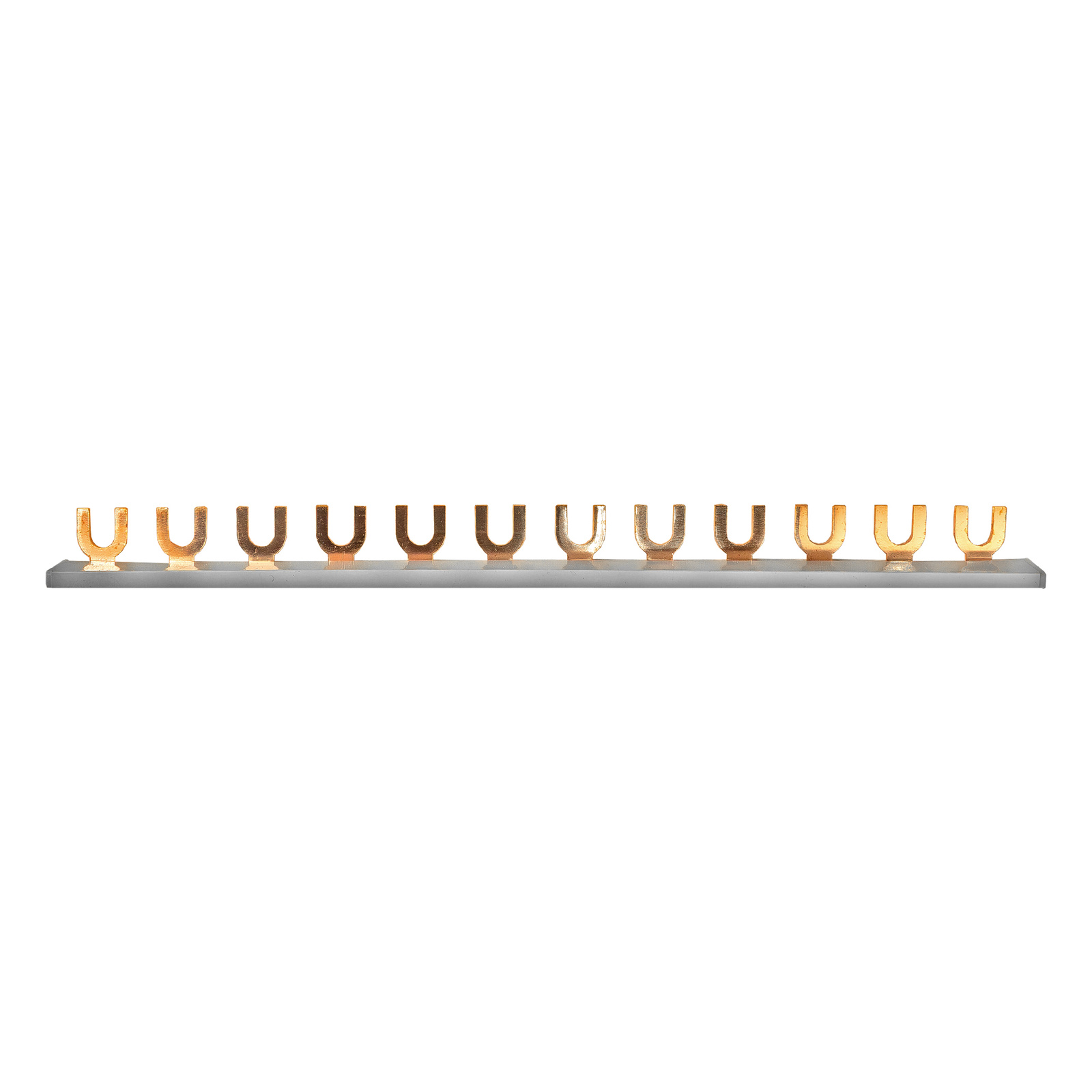 1-polige Phasenschiene mit Gabelanschluss zur sicheren Stromverteilung in modularen Verteilungen. Modell mit 12 Kontakten, 10 mm² Querschnitt und 63A Nennstrom – ideal für Haus- und Industrieinstallationen.
