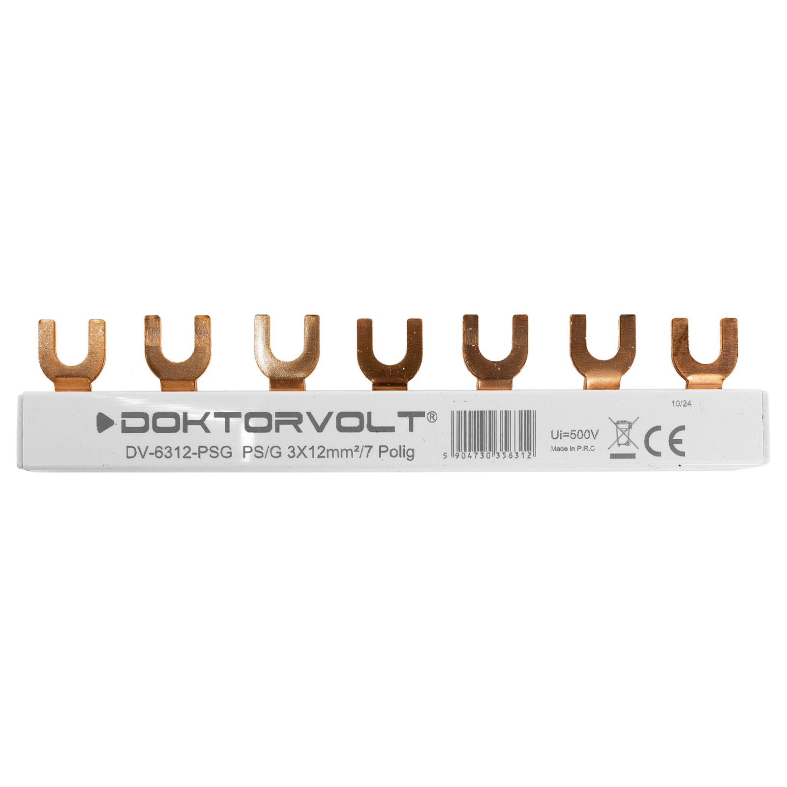Dreipolige Phasenschiene mit Gabelanschluss zur Stromverteilung auf mehrere Leitungsschutzschalter. 7-polig, Querschnitt 12 mm², 80A – ideal für modulare Installationen. Hersteller: Doktorvolt.