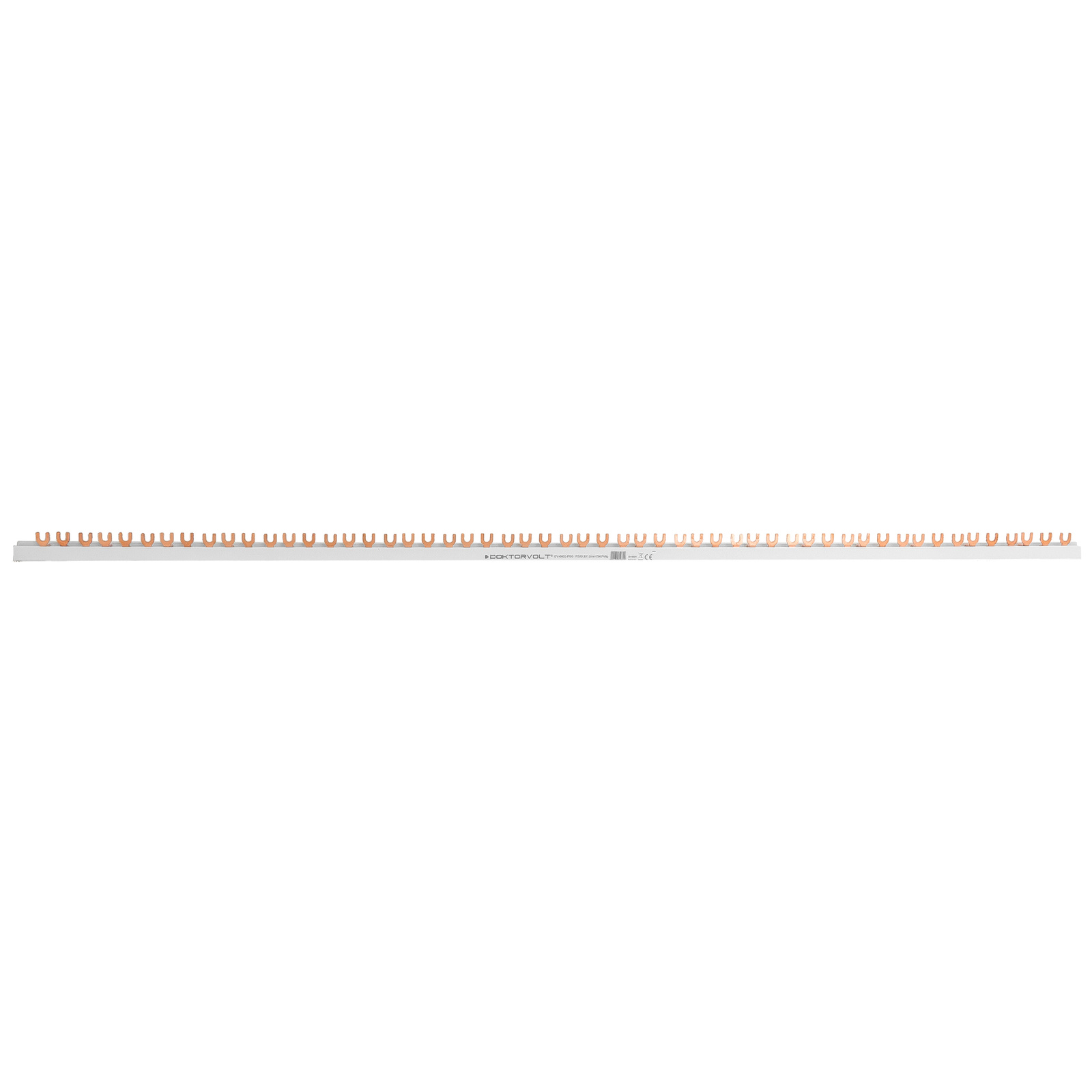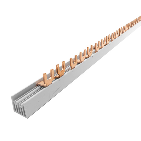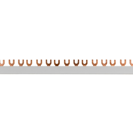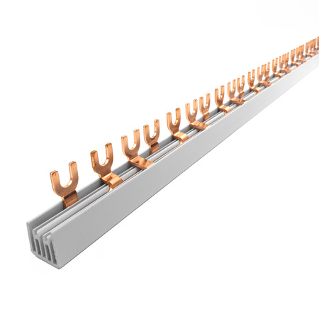 - 3P-Bus mit weißer Oberfläche, 100 cm lang, 12 mm² Querschnitt - für die Versorgung von 54 Modulen in anspruchsvollen Systemen. Bis 80 A belastbar, ideal für große Verteilerschränke im Bau- und Industriebereich.