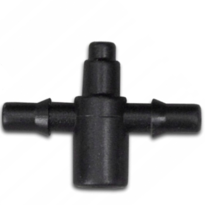 2-Wege Verteiler für 5mm Tropfer mit 3x5mm Microschlauch Anschluss. Aus Kunststoff, wird als Komponente in Bewässerungssystemen verwendet.