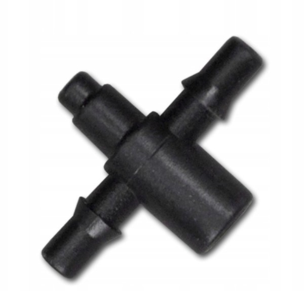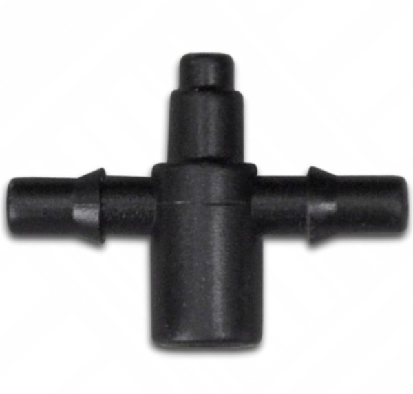 2-Wege Verteiler für 4mm Tropfer mit 3x5mm Microschlauch Anschluss. Aus Kunststoff, wird als Komponente in Bewässerungssystemen verwendet.
