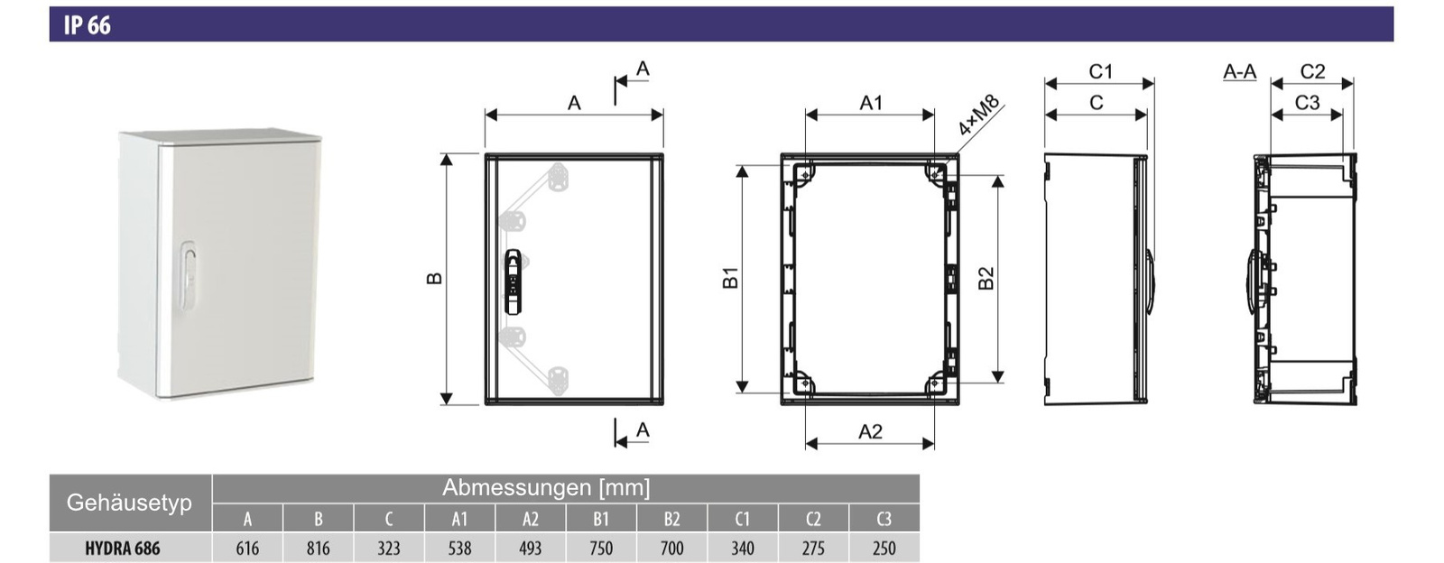 - Abmessungen: Gehäuse HYDRA 686, 616 x 816 x 323 mm