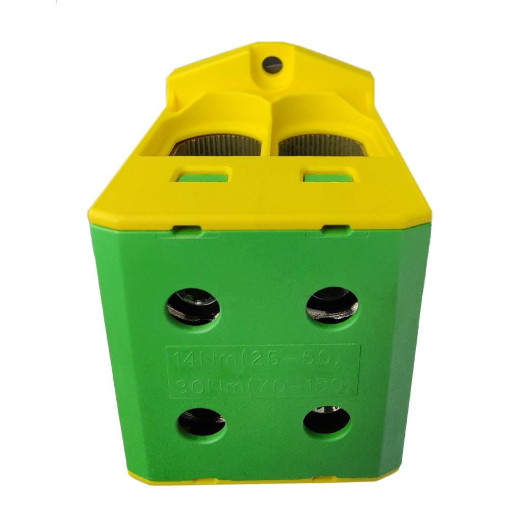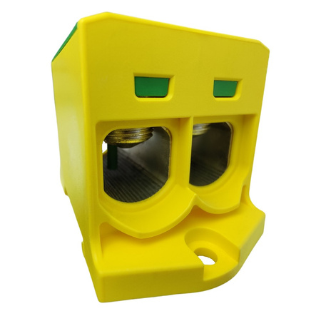 Die Verbindungsklemme OTL150-2 in der gelb-grünen Farbe ist das perfekte Werkzeug zum Verbinden von Leitungen von 25 mm² bis 150 mm².