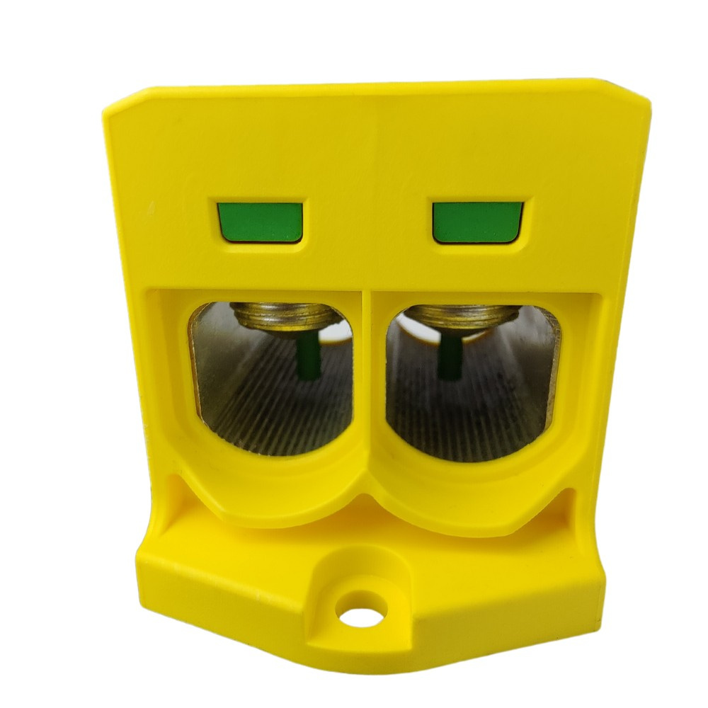 Die Verbindungsklemme OTL150-2 in der gelb-grünen Farbe ist das perfekte Werkzeug zum Verbinden von Leitungen von 25 mm² bis 150 mm².