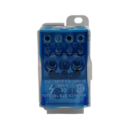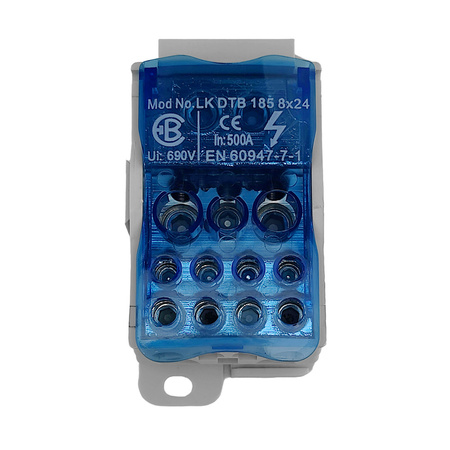 Der Verteilerblock LK DTB arbeitet mit einer Vielzahl von Geräten. Aufgrund seiner Eigenschaften eignet er sich sowohl für den Einsatz in modernen als auch in älteren Elektroinstallationen. Die beiliegende Anleitung führt den Leser übersichtlich durch die Installationsschritte. Die einfache Montage des Verteilerblocks spart Zeit und Installationskosten. Der modulare Verteilerblock LK DTB 185+8×24 dient zum Abzweigen von Leitungen mit größerem Querschnitt auf mehrere Leitungen mit kleinerem Querschnitt. Er ist in 1-poliger Ausführung mit 12 Klemmeneinheiten erhältlich. Die Schrauben können mit einem Inbusschlüssel und einem Schraubendreher PH 2 angezogen werden. Die Verteilerbrücken haben eine leicht zu öffnende, transparente obere Abdeckung aus blauem Kunststoff. Die Oberfläche der Schrauben, die mit dem Leiter in Berührung kommen, ist speziell modifiziert, um die Verformung des Leiters zu minimieren und gleichzeitig die Dichtigkeit so hoch wie möglich zu halten. Die Montage erfolgt auf einer Tragschiene TH 35 und entspricht EN 60947-7-1.