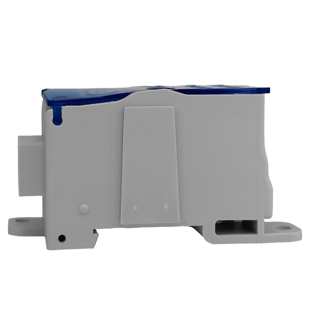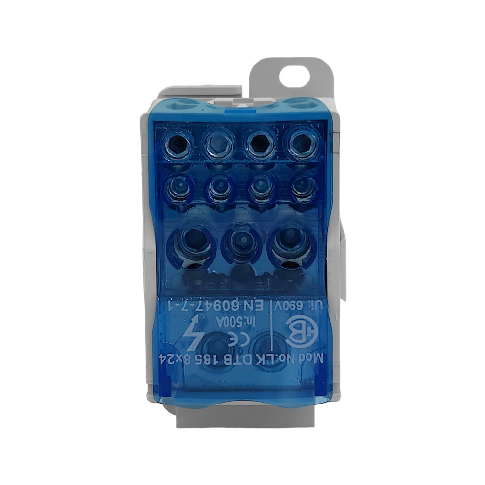 Der Verteilerblock LK DTB arbeitet mit einer Vielzahl von Geräten. Aufgrund seiner Eigenschaften eignet er sich sowohl für den Einsatz in modernen als auch in älteren Elektroinstallationen. Die beiliegende Anleitung führt den Leser übersichtlich durch die Installationsschritte. Die einfache Montage des Verteilerblocks spart Zeit und Installationskosten. Der modulare Verteilerblock LK DTB 185+8×24 dient zum Abzweigen von Leitungen mit größerem Querschnitt auf mehrere Leitungen mit kleinerem Querschnitt. Er ist in 1-poliger Ausführung mit 12 Klemmeneinheiten erhältlich. Die Schrauben können mit einem Inbusschlüssel und einem Schraubendreher PH 2 angezogen werden. Die Verteilerbrücken haben eine leicht zu öffnende, transparente obere Abdeckung aus blauem Kunststoff. Die Oberfläche der Schrauben, die mit dem Leiter in Berührung kommen, ist speziell modifiziert, um die Verformung des Leiters zu minimieren und gleichzeitig die Dichtigkeit so hoch wie möglich zu halten. Die Montage erfolgt auf einer Tragschiene TH 35 und entspricht EN 60947-7-1.
