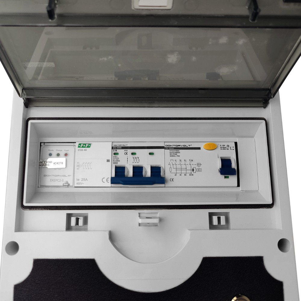 Außerdem verfügt sie über eine Betätigungsklappe 12-Module, eine PG16-Kabelverschraubung zum Anschluss des Starkstromkabels sowie einen Leitungsschutzschalter und Fehlerstromschutzschalter.