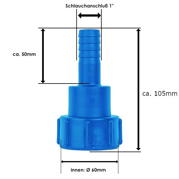 IBC Anschlussadapter mit 1" Schlauchstück für direkten Anschluss an Ihren IBC Container oder 1000 Liter Wassertank mit 60mm Grobgewinde. Der IBC Adapter passt an IBC Container, aller Marken mit Anschlussgewinde S60x6.