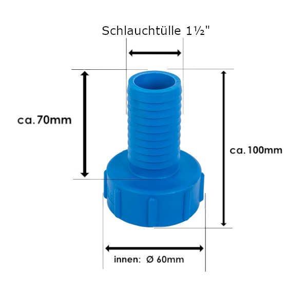 IBC Anschlussadapter mit 1½" Schlauchstück für direkten Anschluss an Ihren IBC Container oder 1000 Liter Wassertank mit 60mm Grobgewinde. Der IBC Adapter passt an IBC Container, aller Marken mit Anschlussgewinde S60x6.