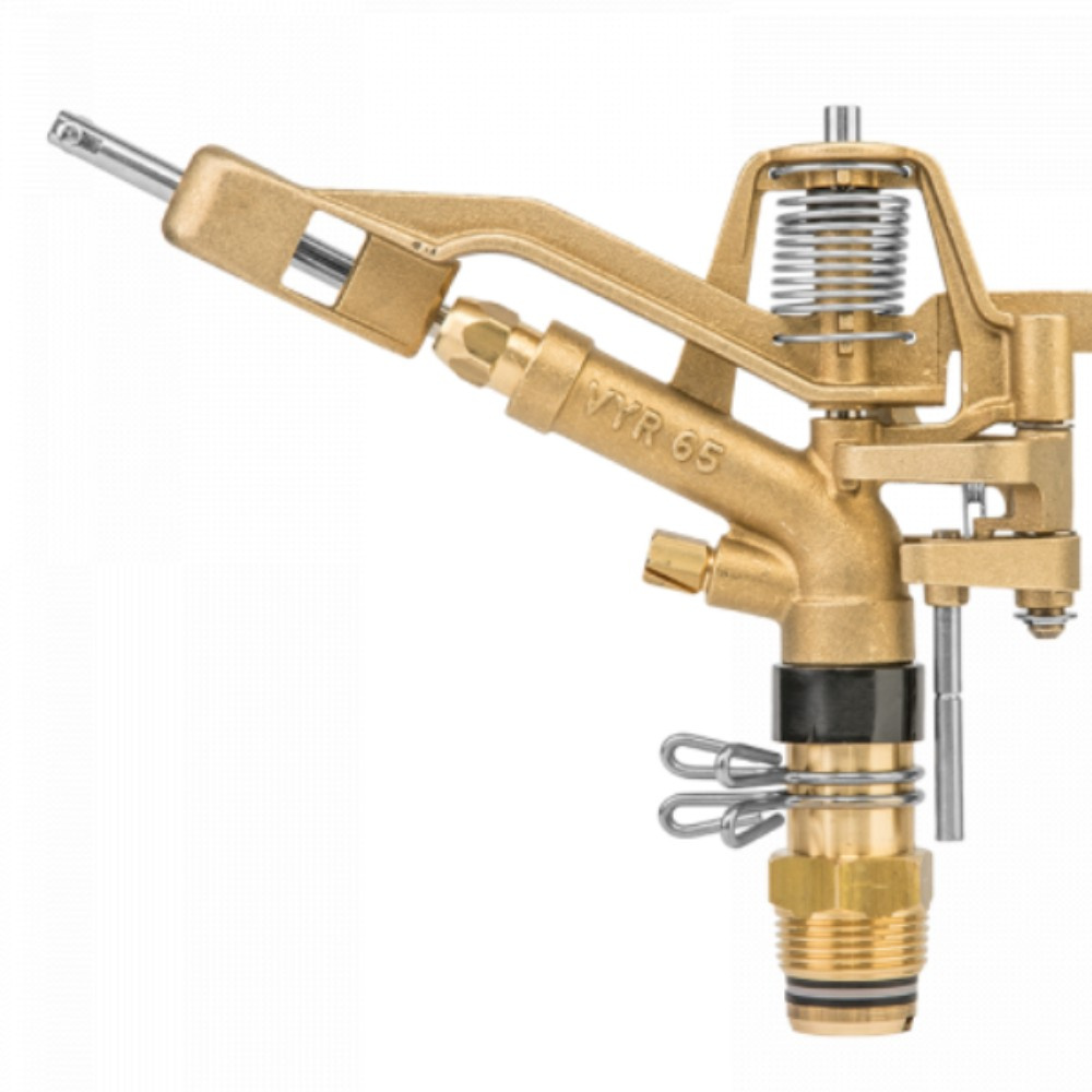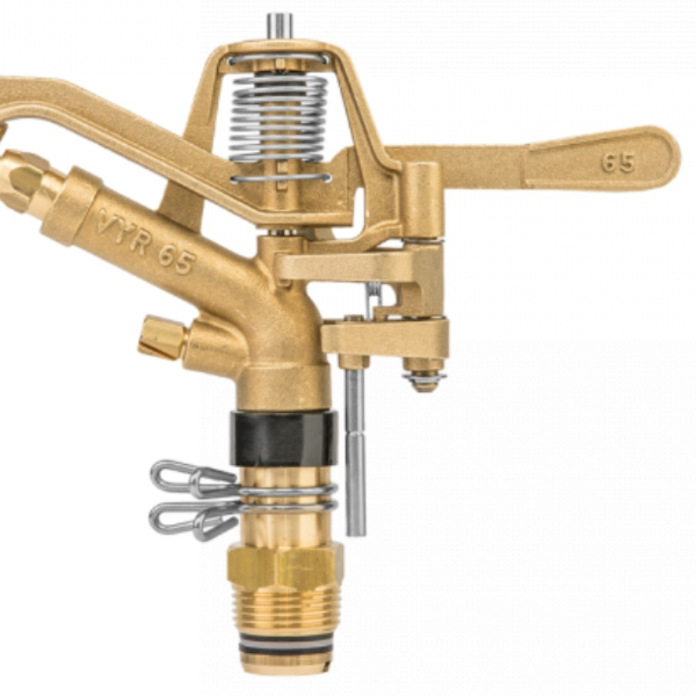 Verstellbarer, impulsförmiger Sektorregner aus Messing mit 1" Außengewinde zur Montage auf einem Dorn oder einem Stativ. Es hat eine stabile Konstruktion, die eine lange und zuverlässige Nutzung garantiert. Der Sprinkler kann von 20° bis 360° eingestellt werden.  Der maximale Durchmesser des Sprinklers beträgt 50m.