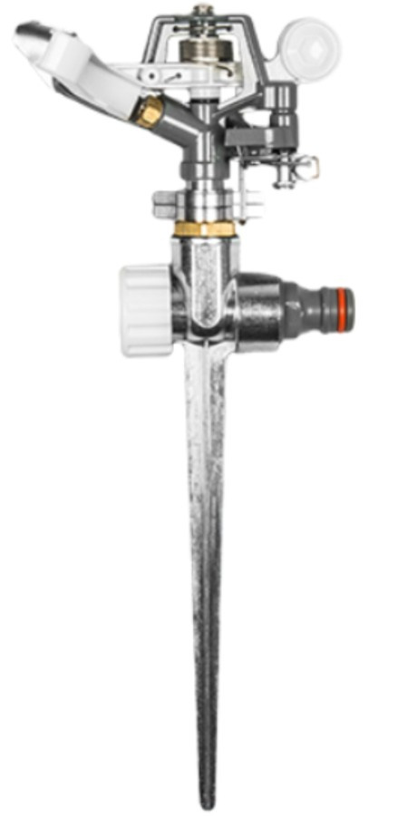 Ein Impulssprinkler, der auf einer Metallspitze getrieben wurde. Der Spike ist mit einem Nippel für Schnellwechsler ausgestattet und eine serielle Verbindung mit anderen Sprinklern ist möglich. Die Beregnungsfläche beträgt 539 m² und der Besprühdurchmesser 26,2 m.