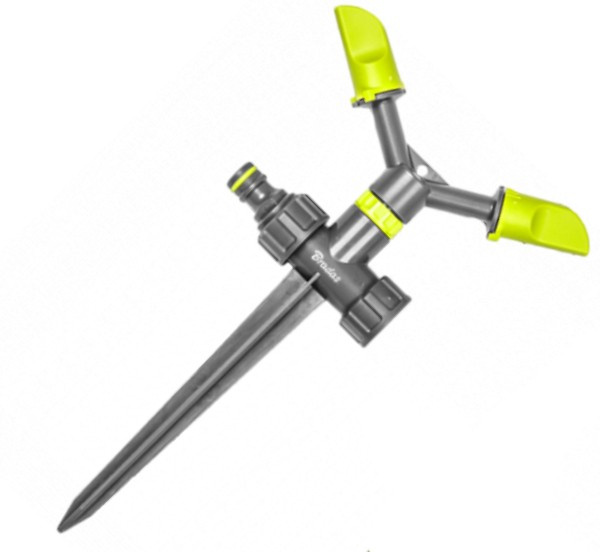 Zweiarmiger Kreisregner mit Erdspieß. Jeder Arm des Sprinklers kann auf den Anwendungsbereich eingestellt werden. Eine Kombination mit anderen Sprinklern ist möglich. Die Sprinklerfläche des LE-6101 beträgt 135m2. Der Kunststoffdorn ermöglicht eine stabile Position des Sprinklers im Boden.