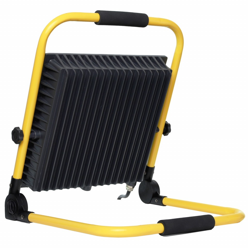 Der Baustrahler ist auf einem Ständer mit verstellbarer Neigung und verstellbarem Lichtwinkel montiert. Nach dem Gebrauch kann der Ständer zusammengeklappt werden, so dass er wenig Platz einnimmt und leicht zu lagern ist.