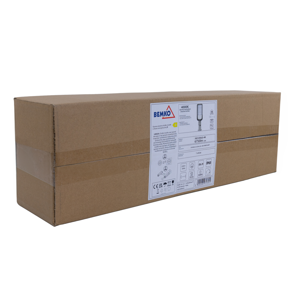 LED-Straßenleuchte JAZMIN mit einer Leistung von 50W und einer Lichtfarbe von 4000K ist eine effiziente Beleuchtungslösung, ideal für den Außenbereich. Sie bietet einen Lichtstrom von 6750lm und einen breiten Abstrahlwinkel von 140°x70°, was eine gleichmäßige Ausleuchtung großer Flächen gewährleistet.
