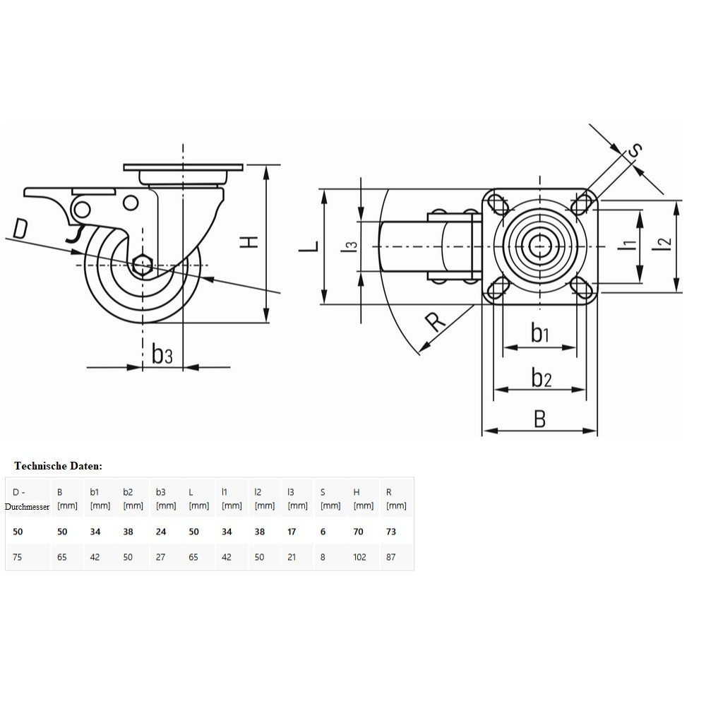 Lenkrolle mit Feststeller mit dem Durchmesser 50 mm bzw. 75 mm