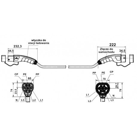 • Eingang: Typ 2 Dreiphasenstecker 16A, Ausgang: Typ 2 Dreiphasenbuchse 16A.