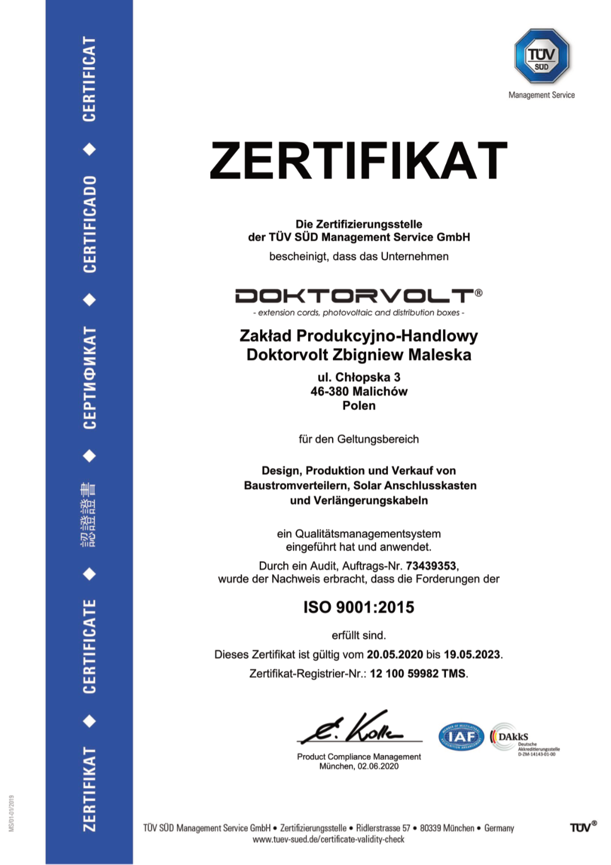 Die Überprüfung und Bestätigung der Einhaltung dieses Standards durch das Unternehmen wird von einschlägigen Organisationen mit Wissen, Erfahrung und internationaler Autorität durchgeführt. Einer von ihnen ist der deutsche TÜV Süd, der die Konstruktion, die Herstellung und den Verkauf von Bau- und Solarstromverteilern sowie Verlängerungskabeln bei Doktorvolt in Malchow bei Guttentag, einem strategischen Partner der Preis-Zone, zertifiziert hat.