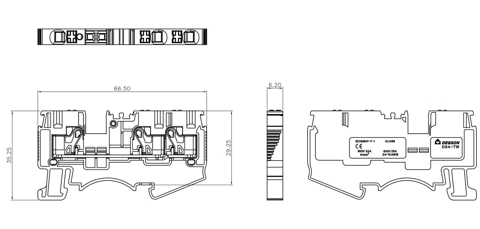 Eine elektrische Installation, die aus vielen Leitern besteht, muss die Kontinuität des Stromflusses im Stromkreis sicherstellen. Durchgangsklemmen sind auf Schienen nach DIN TH / TS 35 montiert und ermöglichen den Anschluss von Drähten und deren Überbrückung. Die Klemmenblöcke der DS4-Serie ermöglichen das Verbinden von Drähten mit einem Querschnitt von 0,2 bis 4 mm2 (24 bis 10 AWG) mit Schraubklemmen. Reihenklemmen bestehen aus hochwertigen Kunststoffen PA66 und UL94V-0. Alle Metallteile in der Klemmen bestehen aus einer beschichteten Kupferlegierung. Installationsklemmen haben viele Tests bestanden, um ihre Qualität und Haltbarkeit zu bestätigen. DS4 TW Lüsterklemme ermöglicht den Anschluss von drei Leitern an einem Pol.