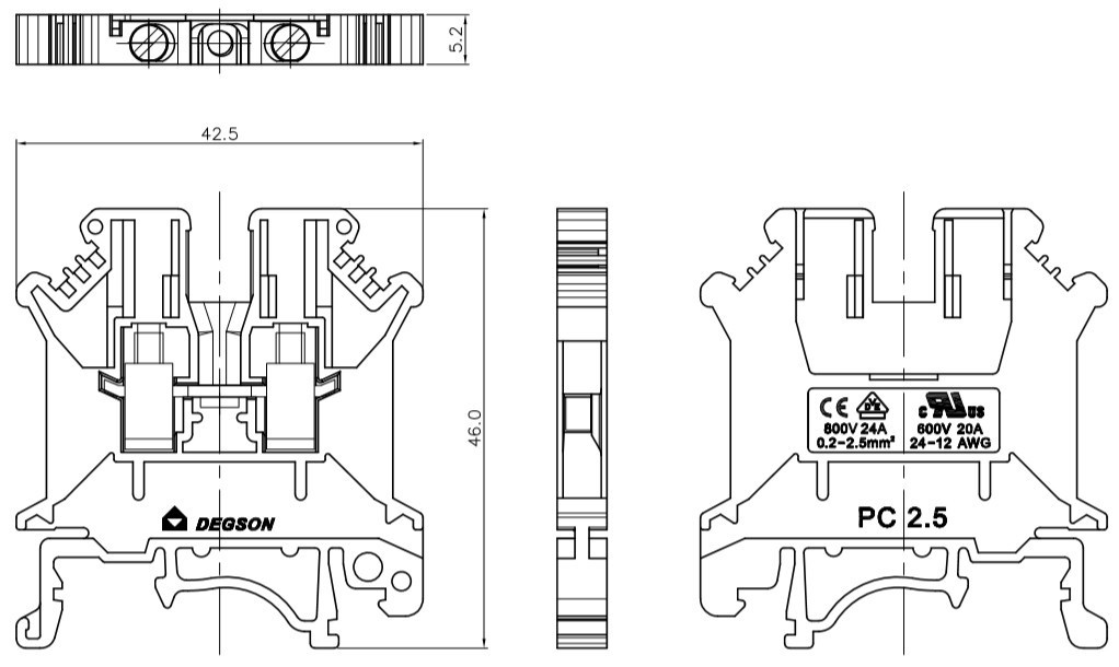Eine elektrische Installation, die aus vielen Leitern besteht, muss die Kontinuität des Stromflusses im Stromkreis sicherstellen. Durchgangsklemmen sind auf Schienen nach DIN TH / TS 35 montiert und ermöglichen den Anschluss von Drähten und deren Überbrückung. Die Klemmenblöcke der PC2.5-Serie ermöglichen das Verbinden von Drähten mit einem Querschnitt von 0,2 bis 2,5 mm2 (24 bis 12 AWG) mit Schraubklemmen. Reihenklemmen bestehen aus hochwertigen Kunststoffen PA66 und UL94V-0. Alle Metallteile in der Klemmen bestehen aus einer beschichteten Kupferlegierung. DEGSON Installationsklemmen haben viele Tests bestanden, um ihre Qualität und Haltbarkeit zu bestätigen. Durchgangsklemmen wurden mit UL- und VDE-Zertifikaten ausgezeichnet.