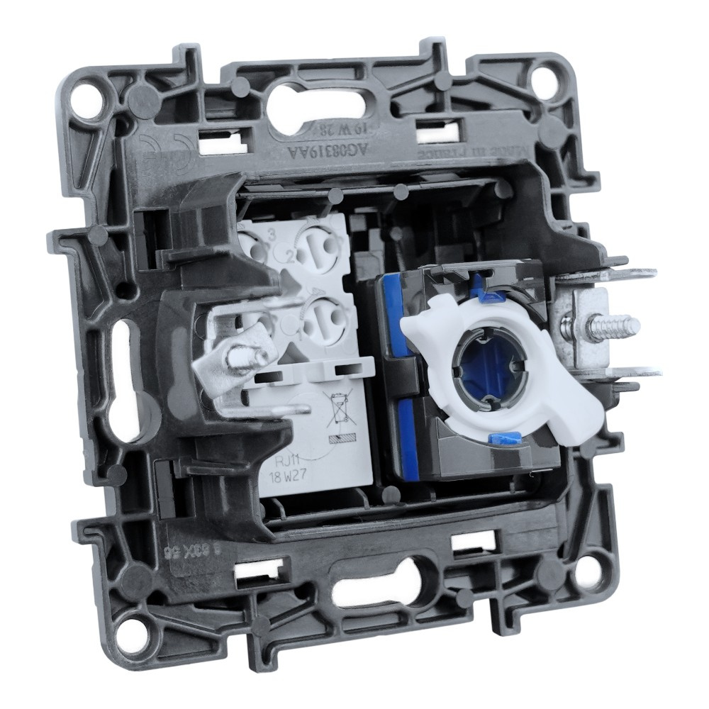 ➡️ Kombidose RJ11 + RJ45. Für den Anschluss eines verdrillten Signalkabels der Kategorie 6 (UTP=Ungeschirmtes Twisted Pair Kabel) (Internet) und eines Telefonkabels geeignet.
