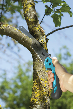 ➡️ Neben einer Aufhängeöse ist die Gartensäge mit einem Schneidenschutz versehen, so dass sie sicher und griffbereit aufbewahrt werden kann.