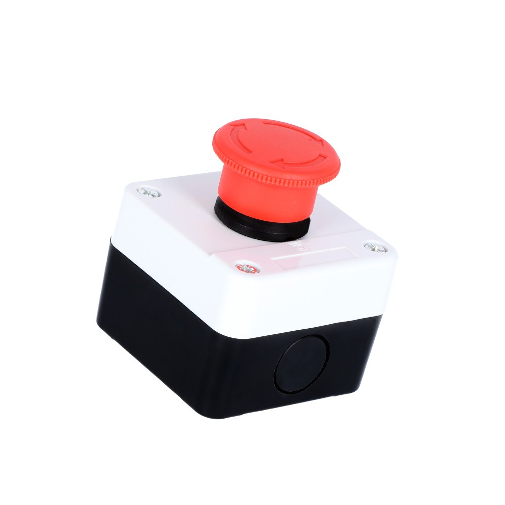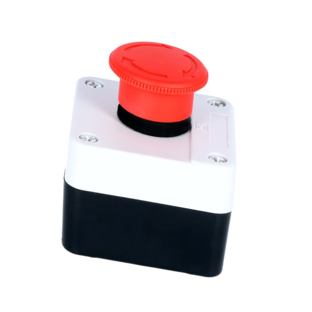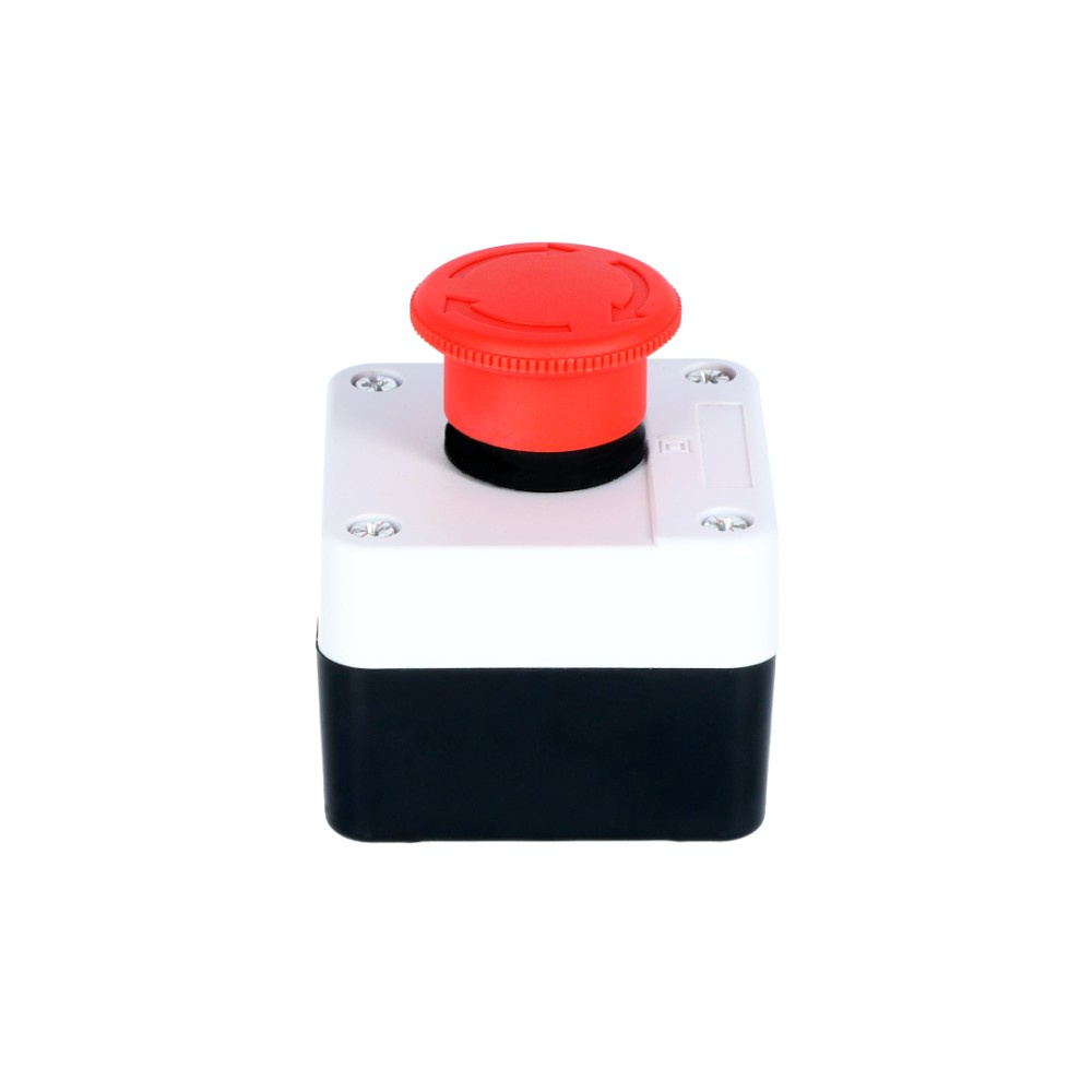 ➡️ Notausschalter mit roter STOP-Taste, ausgestattet mit NC-Kontakt.