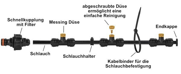 - 7,5m Schlauch - Adapter für Schnellkupplung mit Filter - 5x Messingdüse - 5x Halter zum Fixieren des Schlauches - 5x Clip zum Fixieren des Schlauches |