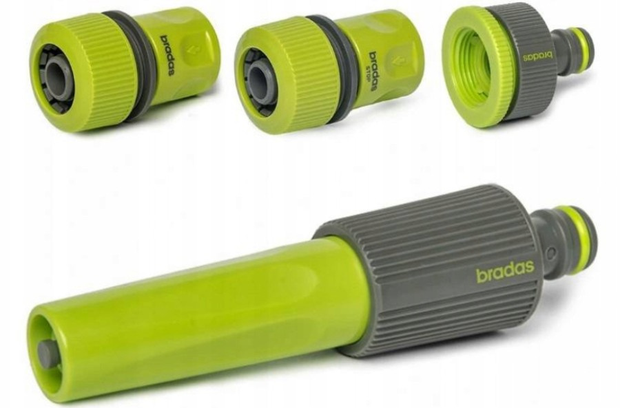 Bewässerungsset der Serie LIME LINE, bestehend aus einer Düse mit universal Nippel für allen typischen Schnellkuplungen ausgestatet, einem Schnellkupplung für 3/4" Schlauch und einem 3/4" Schlauchkupplung mit STOP-Funktion, sowie einem Hahnanschluß für 1" Wasserhahn mit Reduktion für 3/4" und universal Nippel für allen typischen Schnellkuplungen. Die Produkte eignen sich hervorragend zum Anschließen von Gartenschläuchen an Wasserhähne sowie zum Bewässern von Rasenflächen, Gärten, Gewächshäusern, Obstgärten, Sträuchern und anderen Grünflächen.