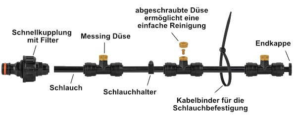 - 15m Schlauch - Adapter für Schnellkupplung mit Filter - 8x Messingdüse - 8x Halter zum Fixieren des Schlauches - 8x Clip zum Fixieren des Schlauches |