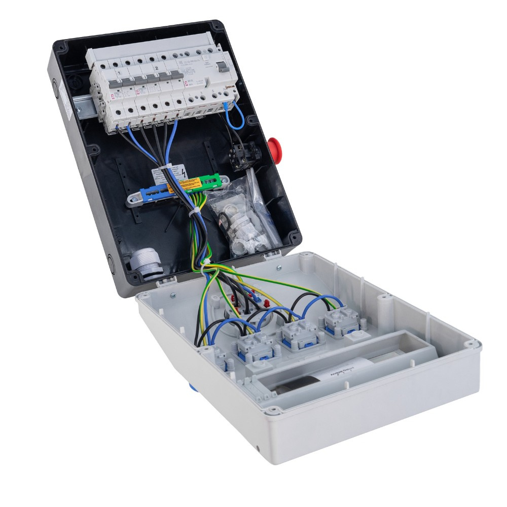 - 4 x einphasige Steckdosen Typ E 1P + N + PE, 16 A, 230 V