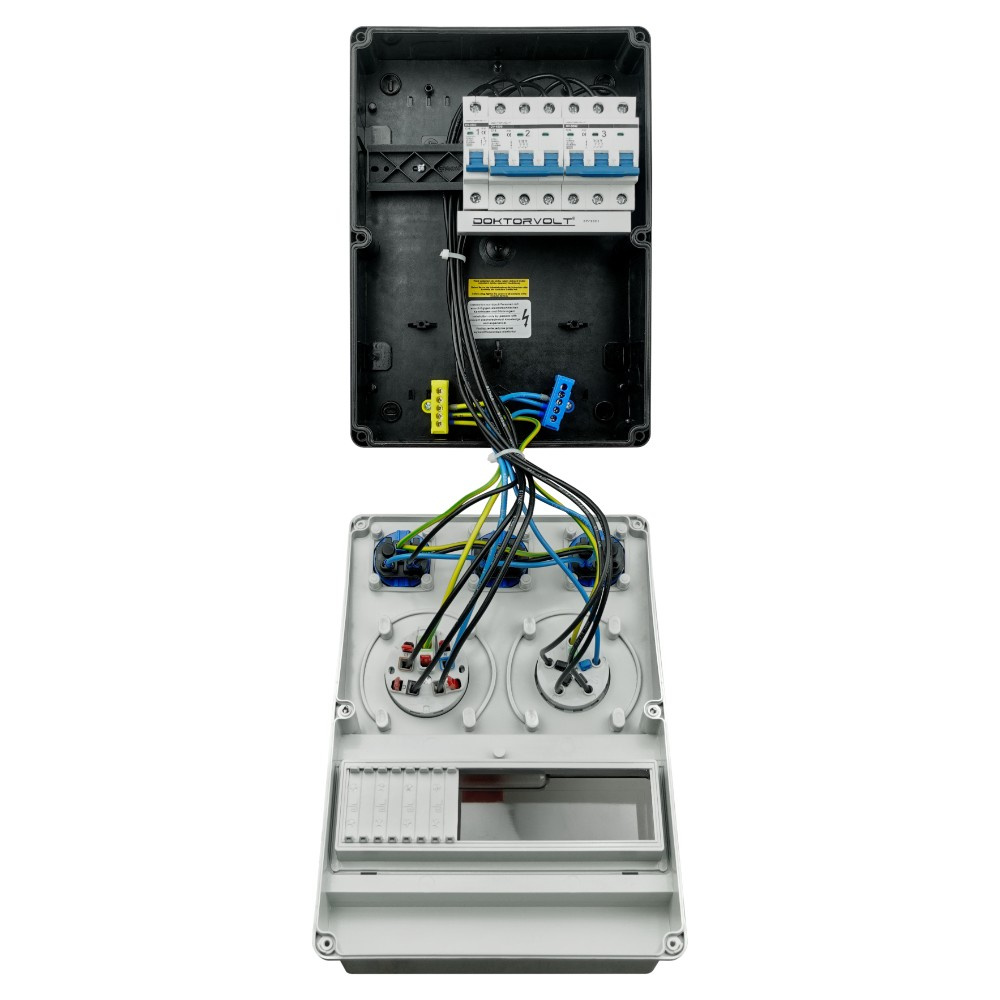 - Mit drei 230V 16A IP54-Steckdosen und zwei CEE-Steckdosen (32A und 16A 5P) versorgt die Schaltanlage mehrere Geräte gleichzeitig – ideal für Werkzeuge, Beleuchtung, Elektrogeräte und Baumaschinen.