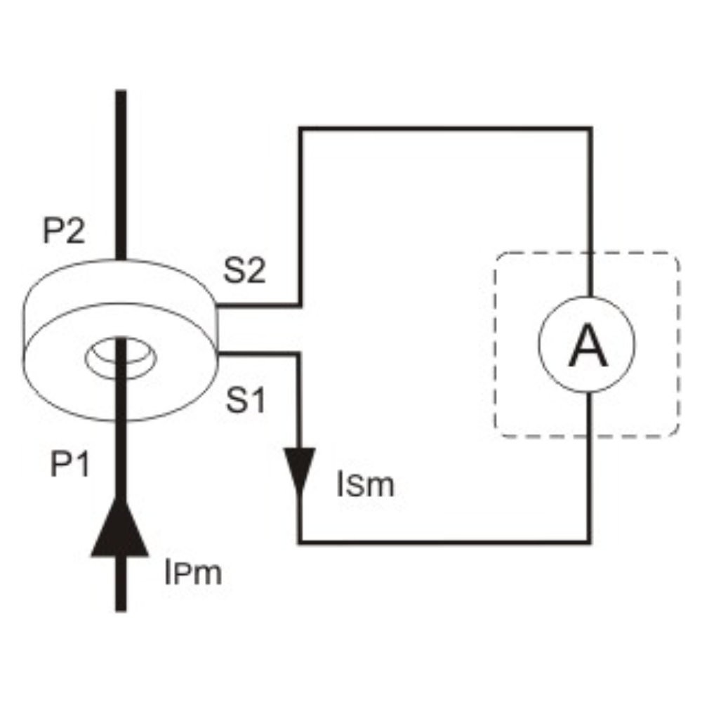 Funktion: Das Kabel mit dem gemessenen Strom führt durch die Hauptöffnung des Transformators (P1 / P2), die einer Wicklung der Primärwicklung entspricht. Die Anschlüsse der Sekundärwicklung S1 und S2 sind mit den Anschlüssen des Messkreises des Steuer- oder Messgerätes verbunden. Das Verhältnis der Ströme in beiden Wicklungen ist ein fester Wert und wird als Stromverhältnis bezeichnet: IPn / ISn = N, wobei IPn - Nennprimärstrom ist; ISn - Sekundärnennstrom; N - Wert der Übertragung. Aus dem Wert des durch die Sekundärwicklung fließenden Stroms kann der Wert des durch die Primärwicklung fließenden Stroms bestimmt werden: ISm * N = IPm, wobei ISm - gemessener Primärstrom; IPm - gemessener Sekundärstrom.