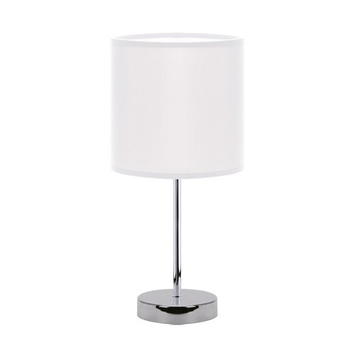 Tischleuchte mit E14-Gewinde. Arbeitet mit Lichtquellen bis zu 40W. Ästhetisch ansprechende Edelstahlleuchte mit einem kunststoffverstärkten Gewebediffusor. Dekoratives chrom-weißes Licht mit eingebautem Schalter.