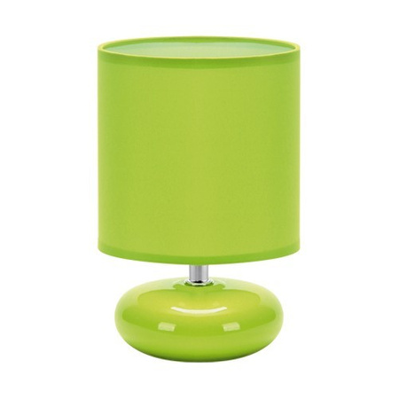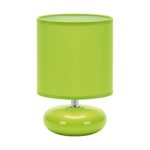 Tischleuchte mit E14-Gewinde. Arbeitet mit Lichtquellen bis zu 40W. Ästhetisch ansprechende Leuchte aus Edelstahl, Keramik und kunststoffverstärktem Gewebe-Lampenschirm. Dekoratives Licht in grün, hat einen Schalter im Lieferumfang.