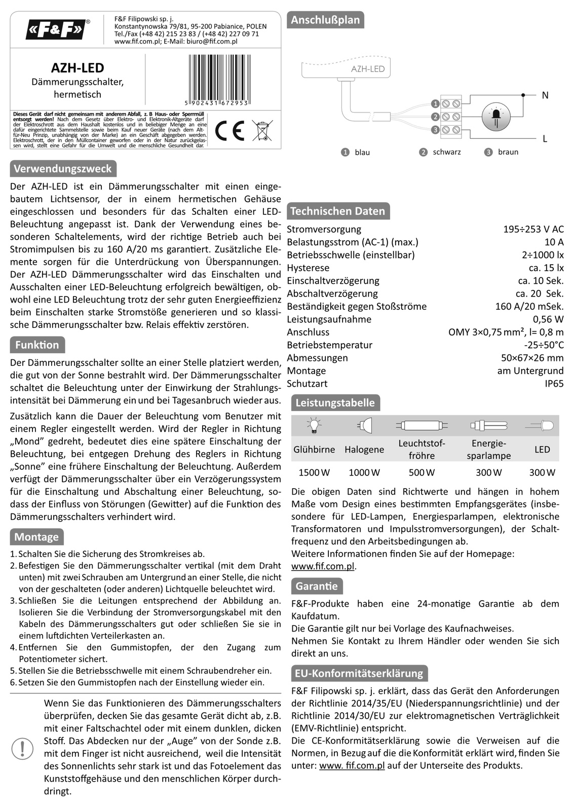 Dämmerungsautomat des Herstellers F&F AZH-LED dient zum Einschalten der LED-Beleuchtung, die mit 230 V betrieben wird. Das Produkt ist aus den hochwertigsten Materialien hergestellt, mit Schutzgrad IP65 in einem hermetischen Gehäuse eingeschlossen und verfügt über einen eingebauten Lichtsensor. Der Dämmerungsautomat AZH-LED ist dank der Verwendung eines Schaltelements, das einen korrekten Betrieb mit Stromimpulsen bis 160 A /20 ms gewährleistet, und zusätzlicher Elemente, die für die Löschstöße verantwortlich sind, zur Steuerung von LED-Lichtquellen oder anderen Energieempfängern bestimmt, die beim Einschalten starke Stromstöße erzeugen, die klassische Relais zerstören können.